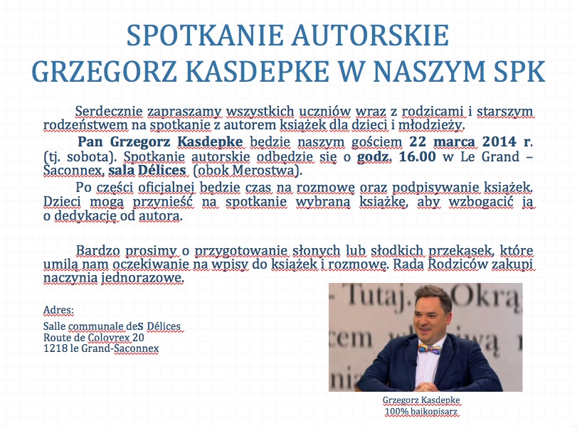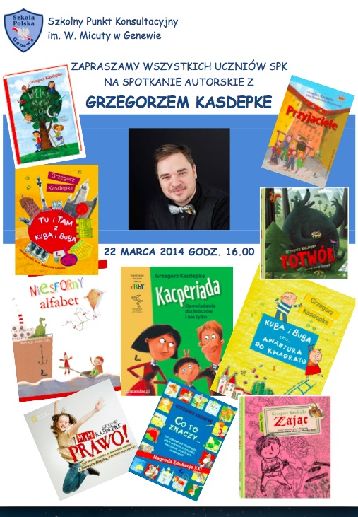 Pan Grzegorz Kasdepke przyjedzie na spotkanie z czytelnikami ze Szkolnego Punku Konsultacyjnego im. W. Micuty w Genewie.