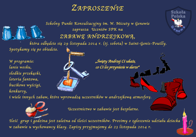 Ilość grup i godzina jest zależna od ilości uczestników. Prosimy o zgłoszenie udziału dziecka w zabawie u wychowawcy klasy. Zapisy przyjmujemy do 23 listopada 2014 r.