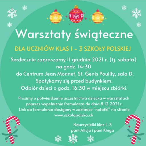 Warsztaty dla uczniów klas 1 - 3 odbędą się 11 grudnia 2021 . Spotykamy się przed budynkiem Centrum Jean Monnet, 01-630 St. Genis Pouilly, o godz. 14:30. Odbiór dzieci o godz. 16:30 w miejscu zbiórki. Prosimy, aby dzieci przyniosły wyposażone piórniki. Będziemy dużo wycinać, składać, przyklejać itp. | |