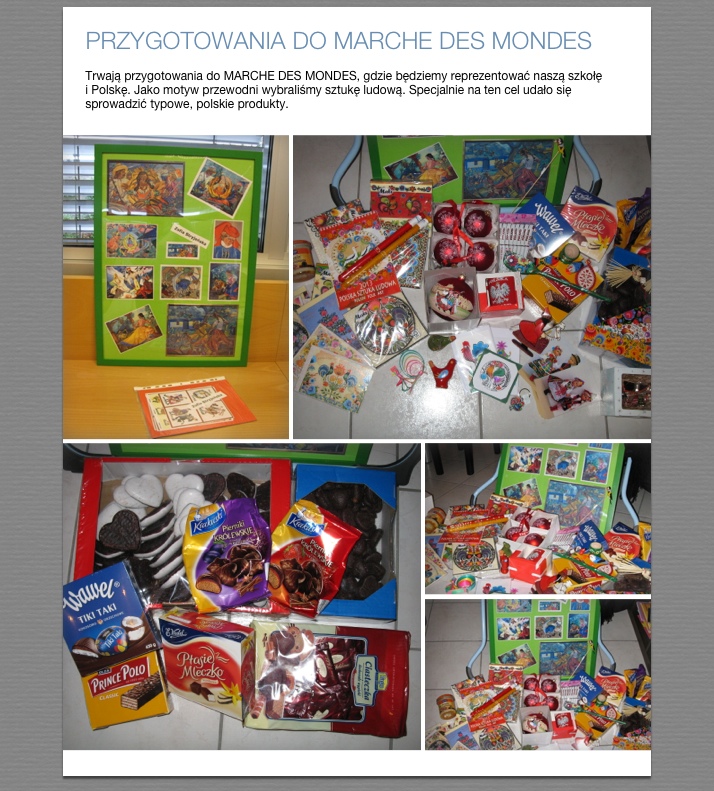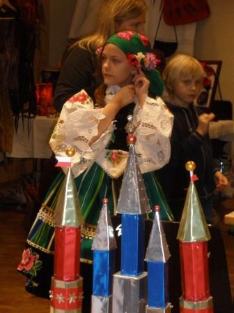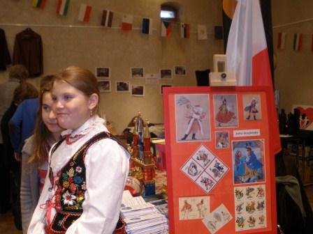 Wychodząc naprzeciw tej inicjatywie, przygotowaliśmy trzy stoły polskie: dwa proponujące polskie produkty i specjały oraz trzeci – stanowisko dla wszystkich dzieci, które zechciały włączyć się w zabawę i prace ręczne. Całość utrzymana była w polskim stylu ludowym, choć z różnych regionów: podziwiano na przykład stroje krakowskie i łowickie; koguciki kurpiowskie, kwiaty łowickie i pawie oczka; zaciekawienie budziły lajkoniki a uznanie - pierniczki toruńskie. Kolorów i życia dodawały dekoracje wykonane á la Zofia Stryjeńska.